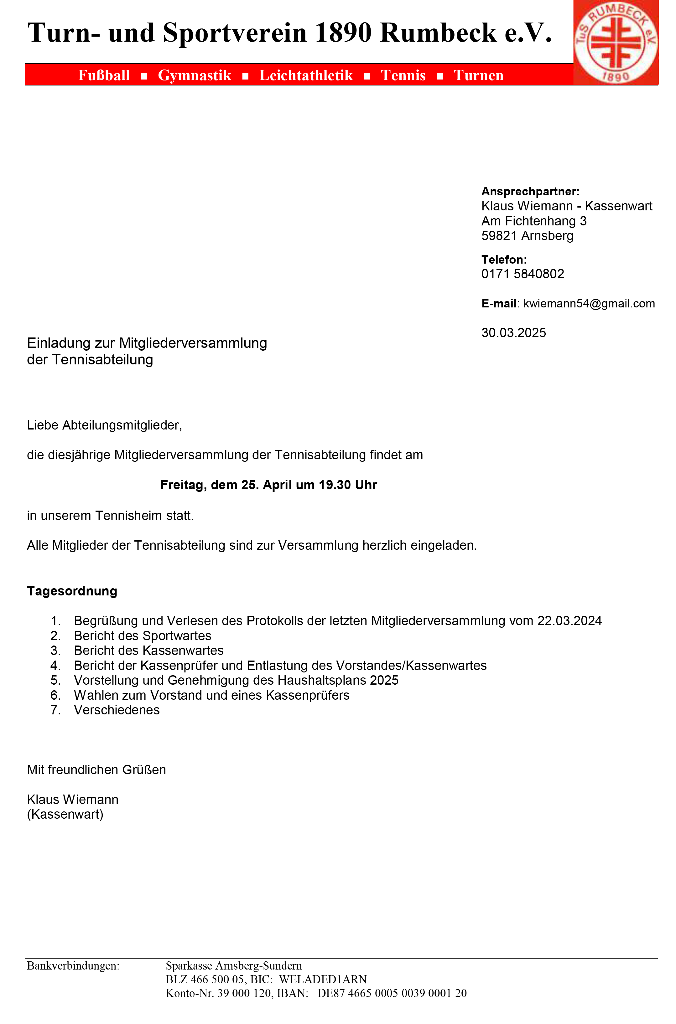 Neben des Vorstandes und des Kassenprüfers gibt es Berichte aus der Tennis-Abteilung und der Haushaltsplan 25 muss genehmigt werden.